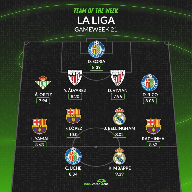 1月28日訊 西甲第21輪比賽戰(zhàn)罷,WhoScored列出了本輪最佳陣容,姆巴佩、貝林厄姆、亞馬爾、拉菲尼亞、費爾明在列。