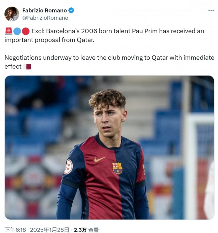 1月28日訊 據(jù)知名記者羅馬諾的消息,巴薩18歲中場普里姆收到卡塔爾俱樂部的報價。