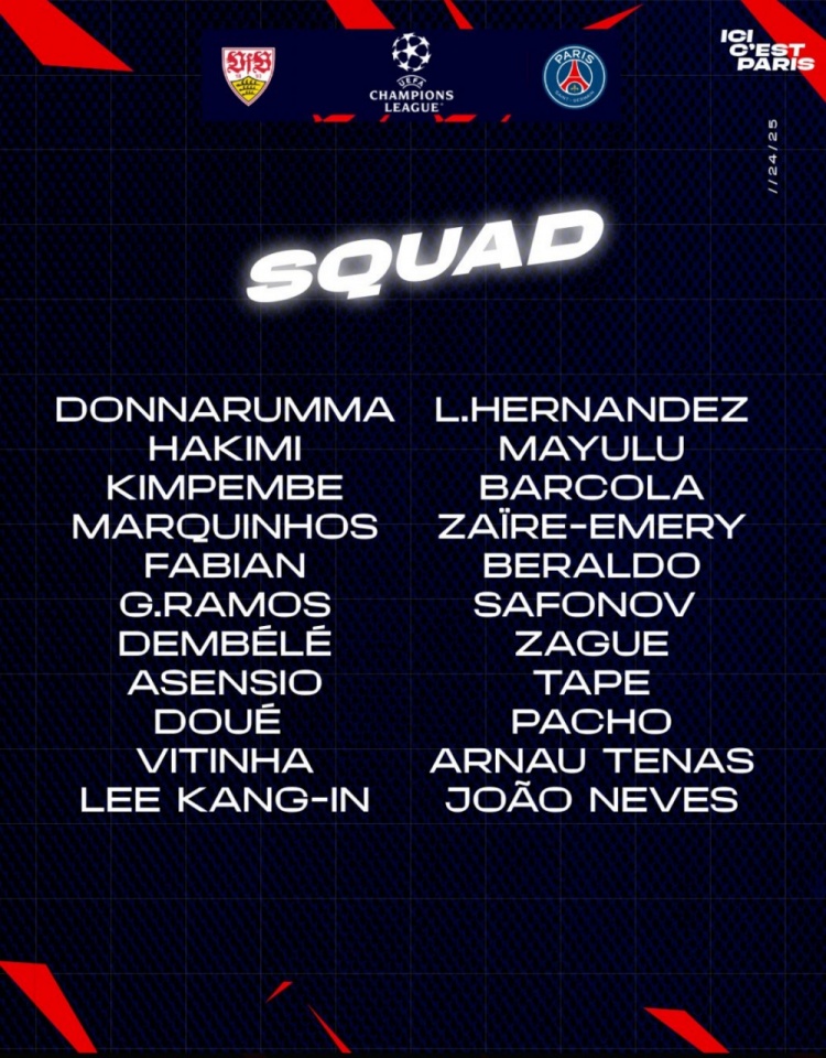 巴黎客戰(zhàn)斯圖加特大名單↓