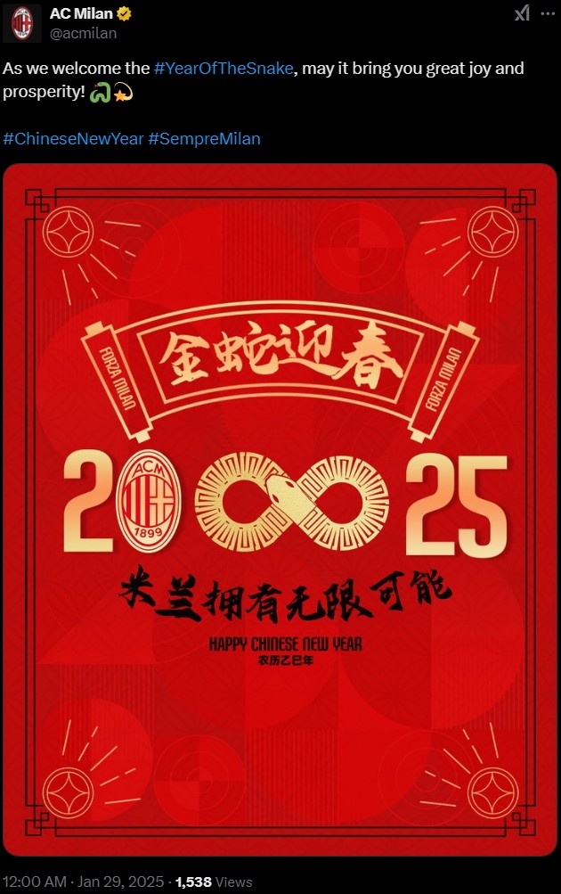 1月29日訊 AC米蘭官推今天曬海報,祝福球迷們蛇年快樂。