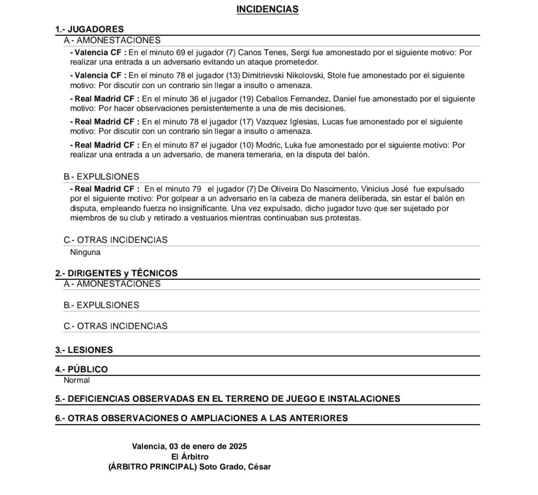 裁判報(bào)告中寫(xiě)道:“第79分鐘,維尼修斯因以下原因被罰下:在無(wú)球情況下,故意用不小的力量擊打?qū)κ诸^部。被罰出場(chǎng)后,該球員被其俱樂(lè)部的人員帶回更衣室,期間他還在持續(xù)抗議?!?/p>