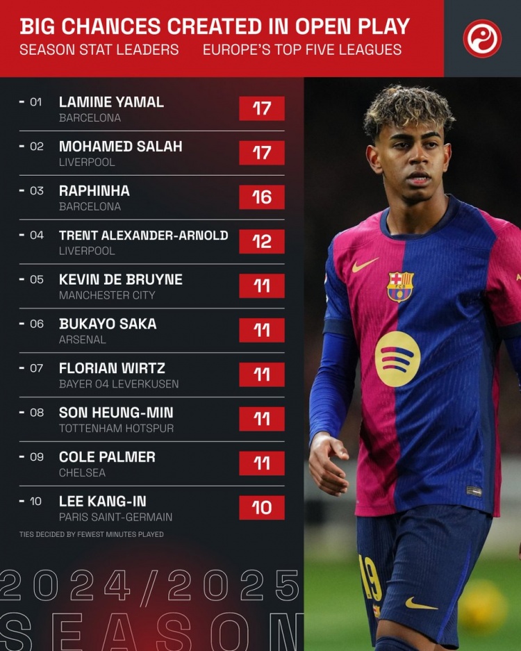 除特別注明外,本站所有內容均為九球直播整理排版,轉載請注明出處:五大聯賽運動戰(zhàn)創(chuàng)造重大機會榜:亞馬爾、薩拉赫17次并列居首