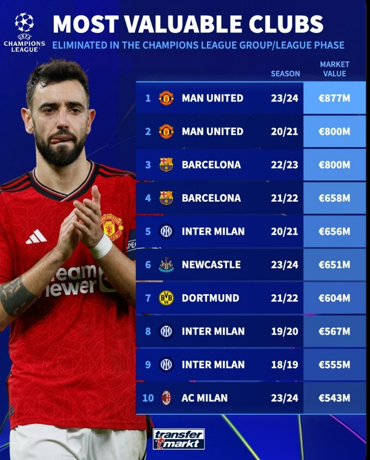 1月29日訊 本賽季歐冠聯(lián)賽階段末輪即將打響,巴黎、曼城仍有被淘汰的可能。德轉(zhuǎn)也盤點(diǎn)了歐冠歷史上第一階段(包括此前的小組賽)被淘汰身價(jià)最高的球隊(duì),其中曼聯(lián)、巴薩、米蘭雙雄都有上榜,具體情況如下:
