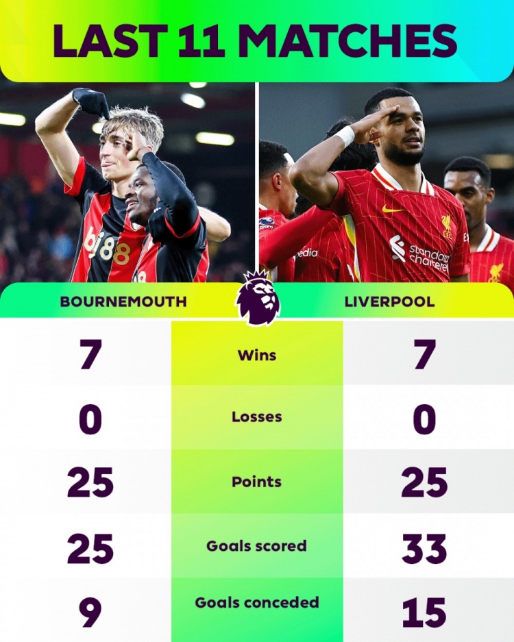 英超官方曬出兩隊(duì)的數(shù)據(jù)海報(bào),預(yù)熱這場(chǎng)比賽,伯恩茅斯和利物浦近11場(chǎng)英超比賽都拿到25分。