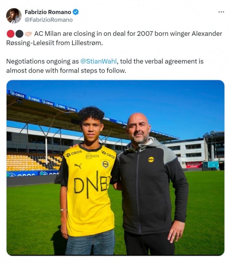 1月29日訊 據(jù)知名記者羅馬諾透露,米蘭接近簽下18歲挪威邊鋒勒萊西特。