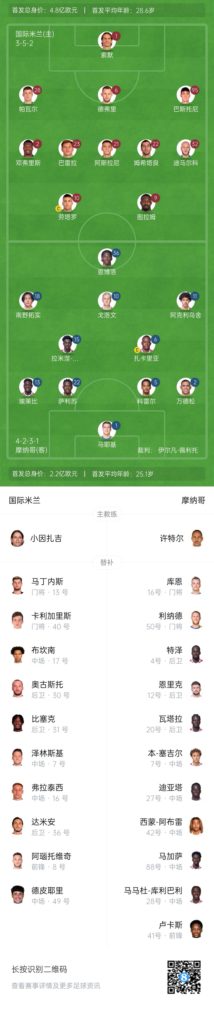 1月30日訊 北京時間1月30日星期四04:00,歐冠聯賽階段第8輪,國際米蘭坐鎮(zhèn)主場梅阿查迎戰(zhàn)摩納哥,目前雙方已經公布了本場比賽的首發(fā)陣容。
