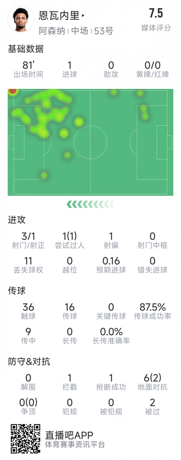 1月30日訊 在本輪歐冠阿森納對陣赫羅納的比賽中,恩瓦內(nèi)里表現(xiàn)出色,以下為他在本場數(shù)據(jù):