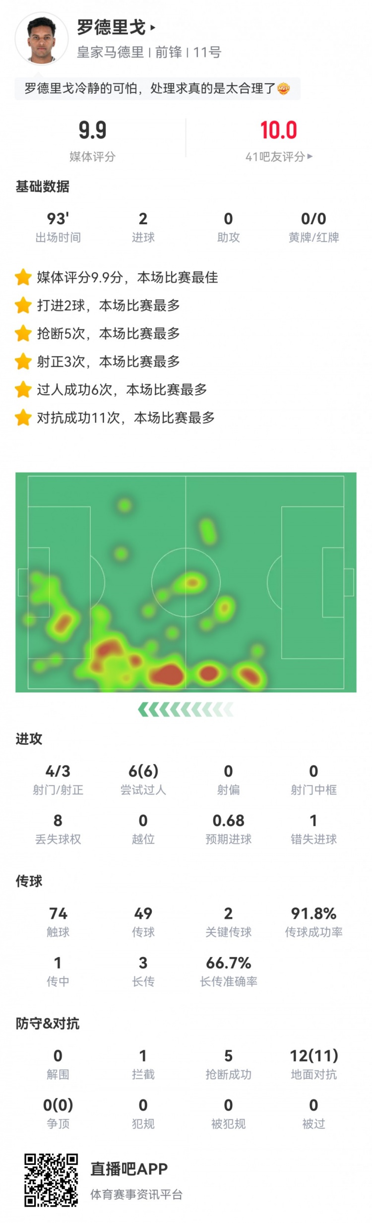 除特別注明外,本站所有內(nèi)容均為九球直播整理排版,轉(zhuǎn)載請(qǐng)注明出處:羅德里戈數(shù)據(jù):2粒進(jìn)球,6次過(guò)人全成功,11次成功對(duì)抗,評(píng)分9.9