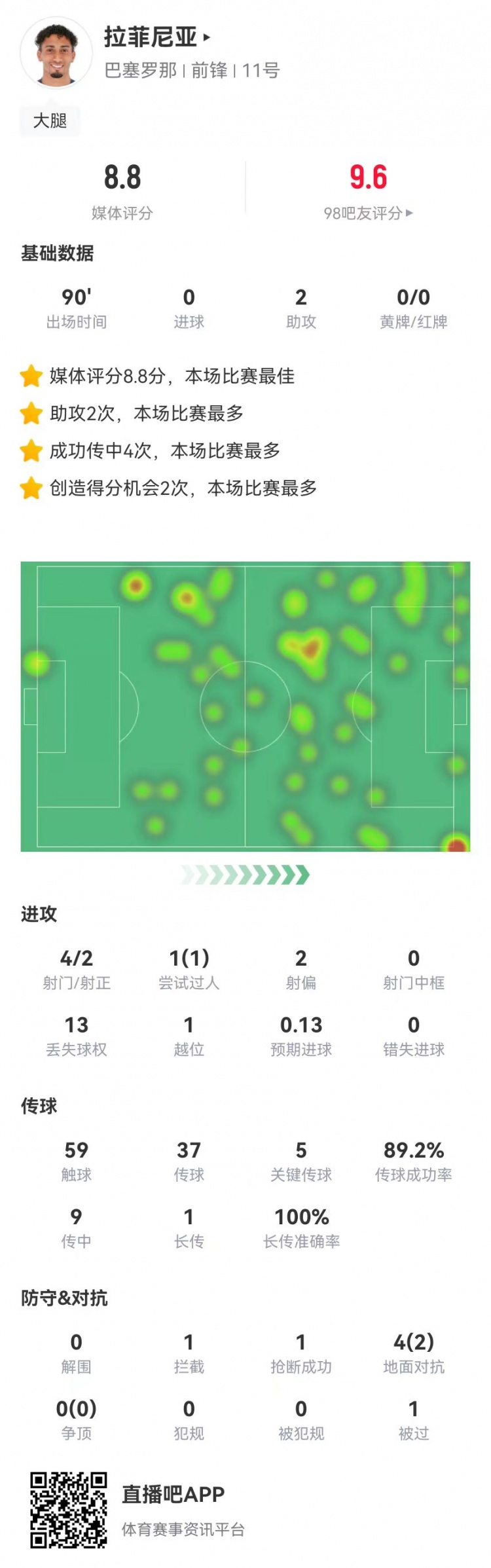 1月30日訊 巴薩在本輪歐冠2-2戰(zhàn)平亞特蘭大,拉菲尼亞本場(chǎng)數(shù)據(jù)如下:
