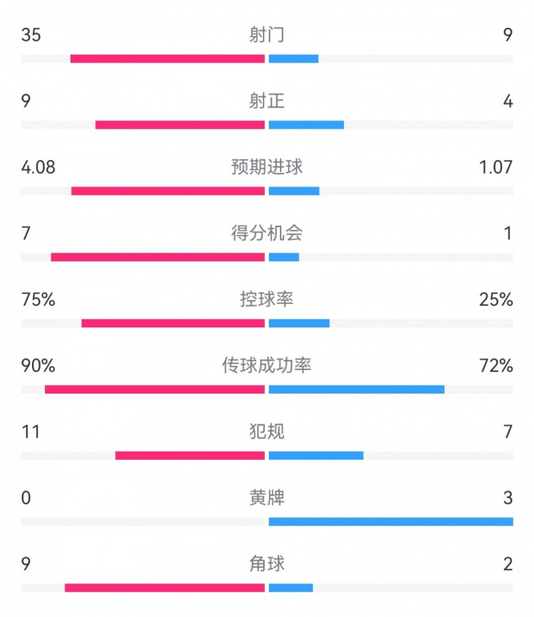 發(fā)布時間:2025年01月30日 06:50點擊:欄目:足球新聞 1月30日訊 歐冠末輪,拜仁主場3-1布拉迪斯拉發(fā)。雙方全場重點數(shù)據(jù)對比如下↓(主隊拜仁在前,客隊布拉迪斯拉發(fā)在后)射門35-9射正9-4預(yù)期進球4.08-1.07得分機會7-1控球率75%-25%傳球成功率90%-72%犯規(guī)11-7黃牌0-3角球9-2 除特別注明外,本站所有內(nèi)容均為九球直播整理排版,轉(zhuǎn)載請注明出處:拜仁3-1布拉迪斯拉發(fā)數(shù)據(jù):射門35-9,射正9-4,得分機會7-1 本文標(biāo)簽: 足球 德甲 拜仁慕尼黑 歐冠