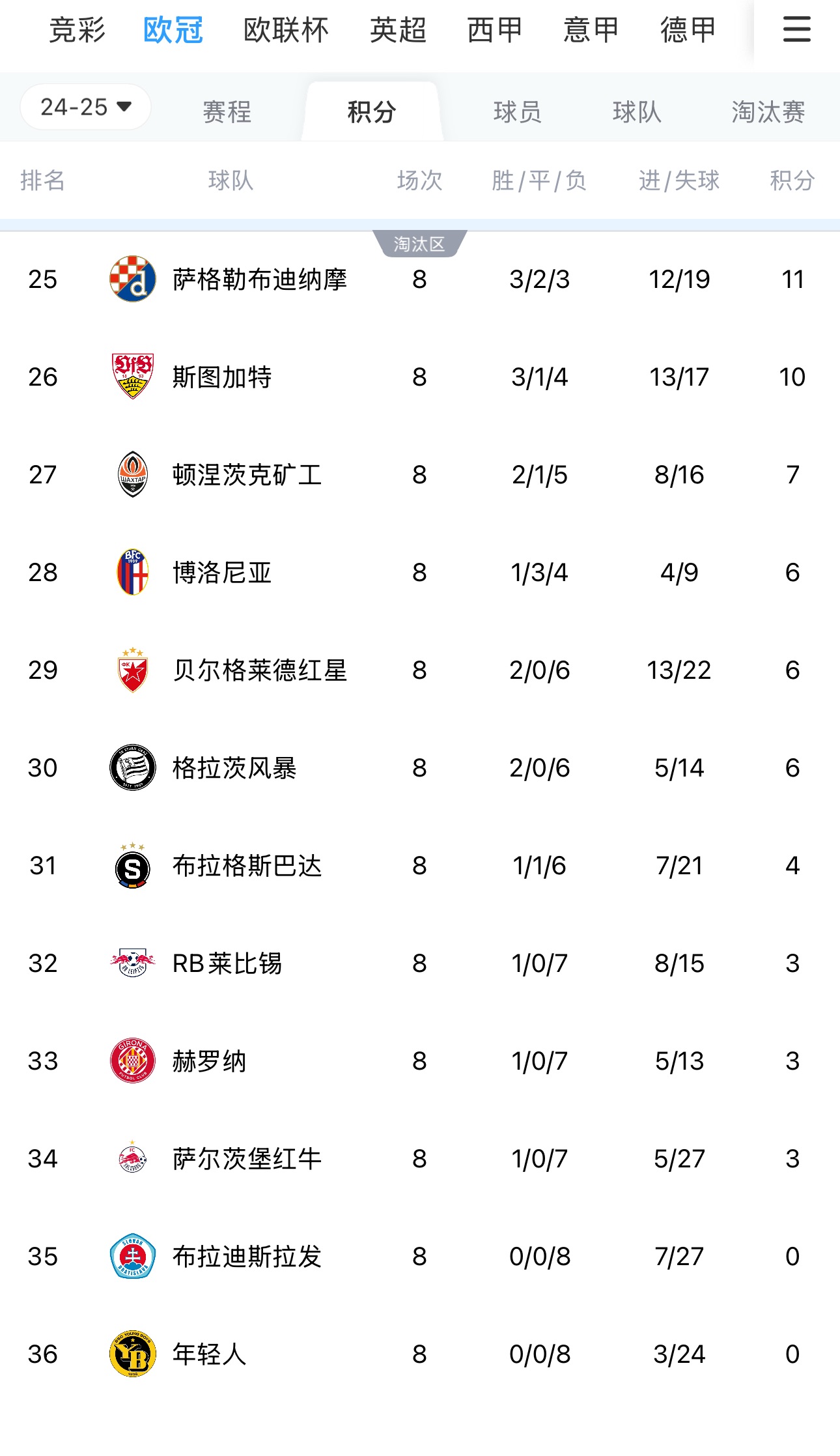 1月30日訊 北京時(shí)間1月30日星期四04:00,歐冠聯(lián)賽階段第8輪,18場(chǎng)比賽同時(shí)開打,最終各支球隊(duì)的命運(yùn)也揭曉,排名25-36名的12支球隊(duì)正式出爐。由于賽事改制,歐冠聯(lián)賽階段出局的球隊(duì)正式被淘汰,無緣任何歐戰(zhàn)賽事。