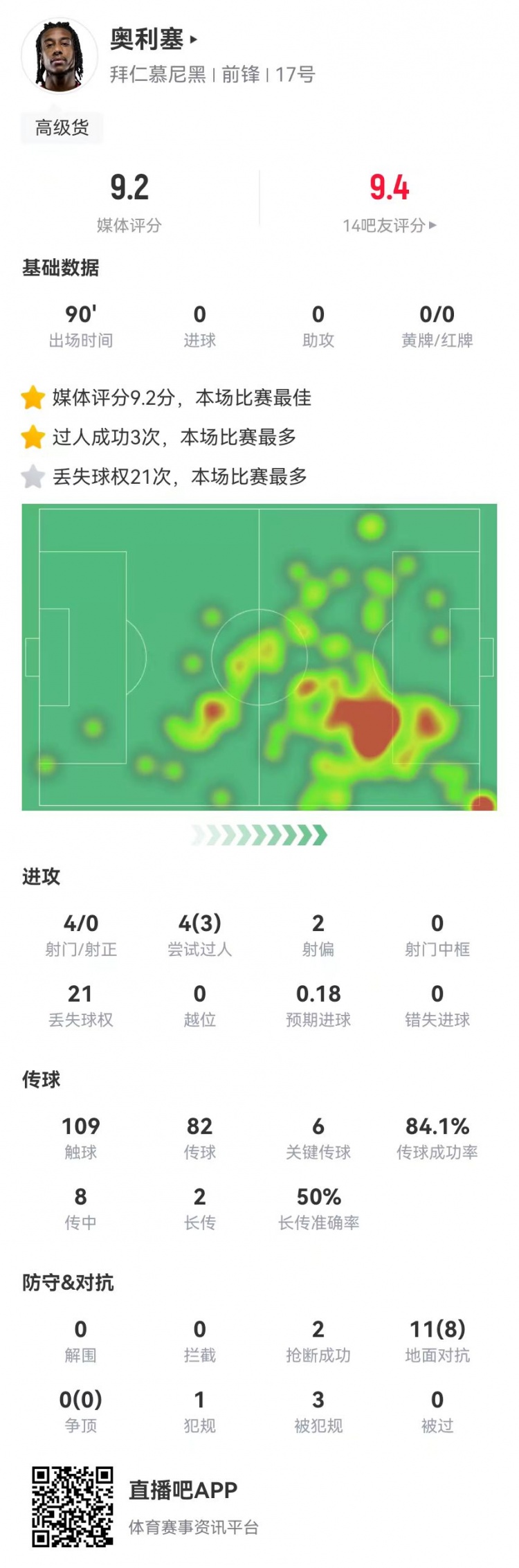1月30日訊 拜仁在本輪歐冠3-1擊敗布拉迪斯拉發(fā),奧利塞本場數(shù)據(jù)如下: