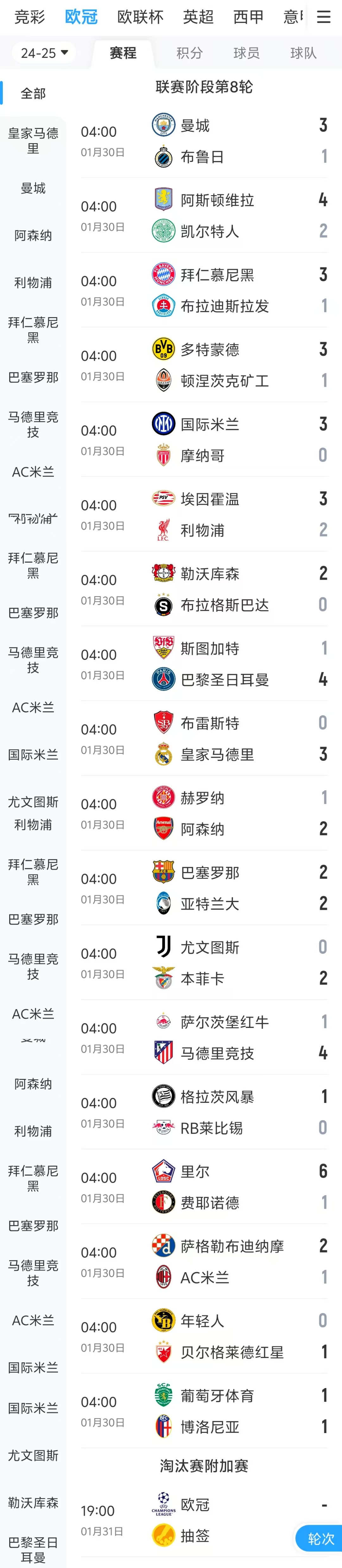 01月30日訊 北京時(shí)間1月30日星期四04:00,歐冠聯(lián)賽階段第8輪,18場(chǎng)比賽同時(shí)開打,歐冠聯(lián)賽階段收官戰(zhàn)綜述如下!