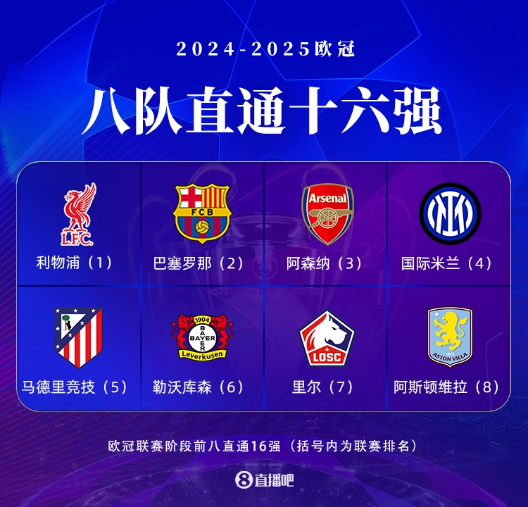 “聯(lián)賽階段”打完有8支隊(duì)伍拿到了直通淘汰賽的資格,分別是(按排名)利物浦、巴塞羅那、阿森納、國(guó)際米蘭、馬德里競(jìng)技、勒沃庫(kù)森、里爾和阿斯頓維拉。前四位雖然都是豪門級(jí)別,馬競(jìng)也算是歐冠老手了,不過勒沃庫(kù)森、里爾、維拉的突圍還是很多人沒想到的。特別是在跟很多強(qiáng)手過招后,他們還能出現(xiàn)在這個(gè)位次,真的不是浪得虛名。