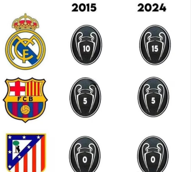 過去9年,西甲三強(qiáng)歐冠冠軍數(shù)的變化