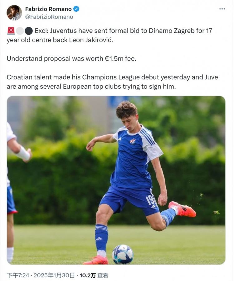 1月30日訊 據(jù)意大利記者羅馬諾透露,尤文150萬歐報(bào)價(jià)薩格勒布迪納摩17歲中衛(wèi)亞基羅維奇。
