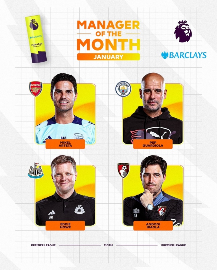 1月30日訊 英超官方公布了1月最佳主帥的候選名單,瓜迪奧拉、阿爾特塔、埃迪-豪和伊拉奧拉獲得提名。