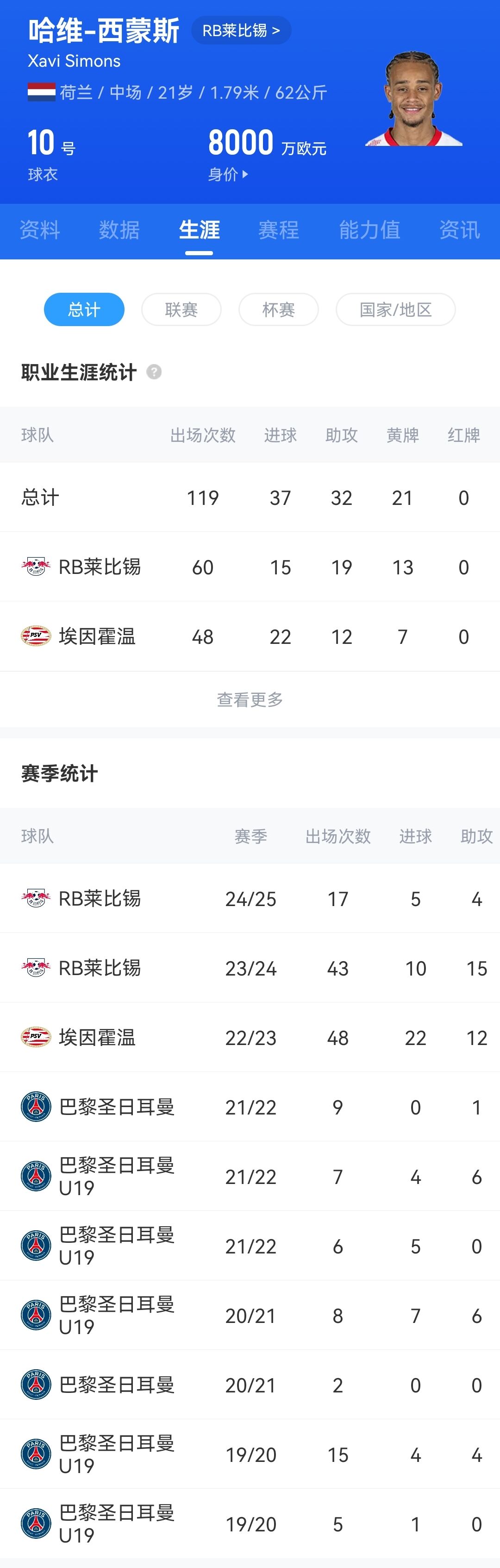 哈維-西蒙斯近兩個賽季被巴黎外租至萊比錫,本賽季西蒙斯代表萊比錫出戰(zhàn)17場,貢獻5球4助攻。