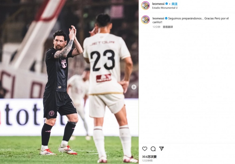 梅西也在賽后通過社媒曬出自己的比賽照,并表示:“我們繼續(xù)做好備戰(zhàn),感謝秘魯?shù)膼?。?/p>