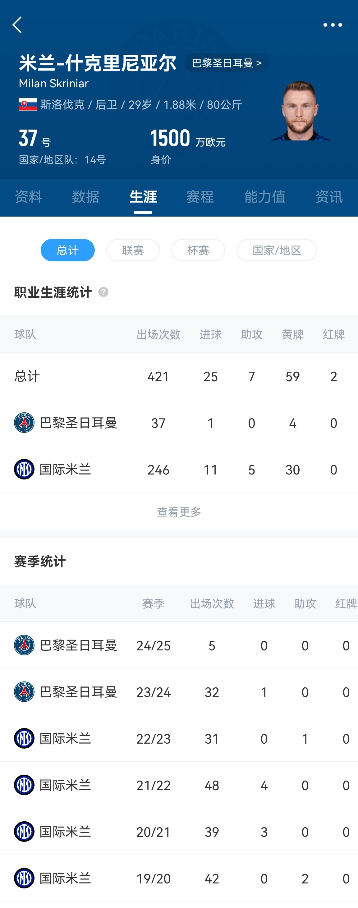 29歲的斯洛伐克中衛(wèi)什克里尼亞爾,2023年夏窗自由身離開(kāi)國(guó)米,免簽加盟巴黎圣日耳曼。本賽季什克遭到主帥恩里克棄用,僅代表球隊(duì)出戰(zhàn)5場(chǎng)比賽,目前什克的德轉(zhuǎn)身價(jià)為1500萬(wàn)歐元。