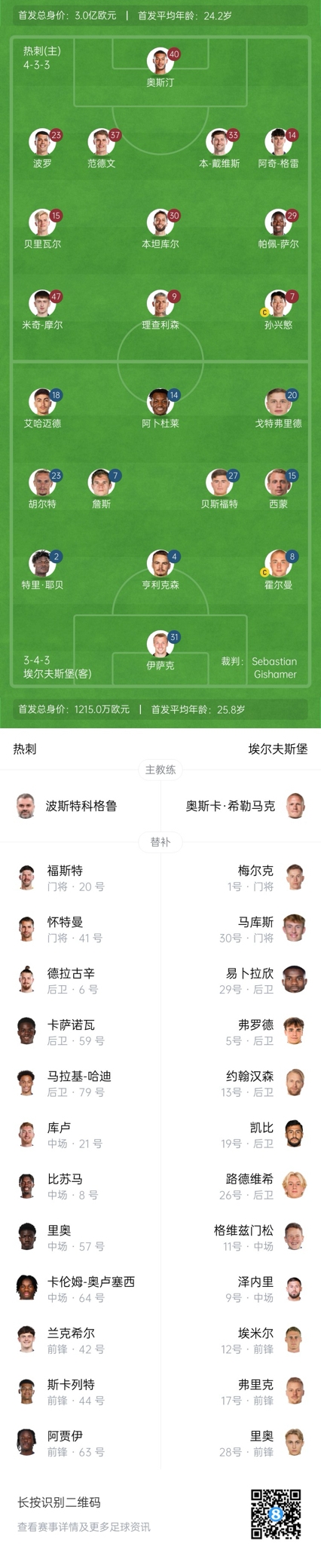 熱刺替補:20-福斯特、41-懷特曼、6-德拉古辛、8-比蘇馬、21-庫魯塞夫斯基、42-蘭克希爾、44-斯卡利、57-凱雷馬滕、59-卡薩諾瓦、63-阿賈伊、64-奧盧塞斯、79-哈迪