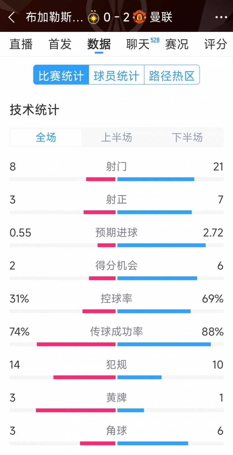 1月31日訊 在本輪歐聯(lián)杯,曼聯(lián)2-0擊敗布加勒斯特星,以下為雙方全場(chǎng)數(shù)據(jù)對(duì)比: