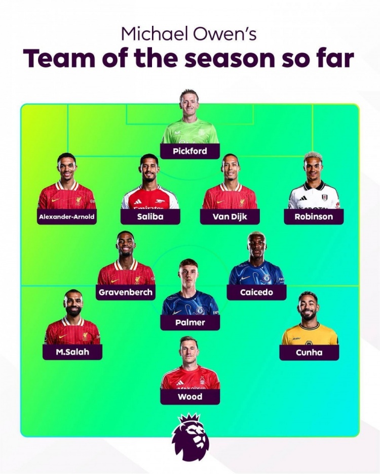 1月4日訊 英超賽程已經過半,英格蘭名宿歐文評選出了他心目中的賽季至今最佳陣容。其中,薩拉赫、范迪克領銜,帕爾默、赫拉芬貝赫、凱塞多搭檔中場,阿諾德、薩利巴在列。