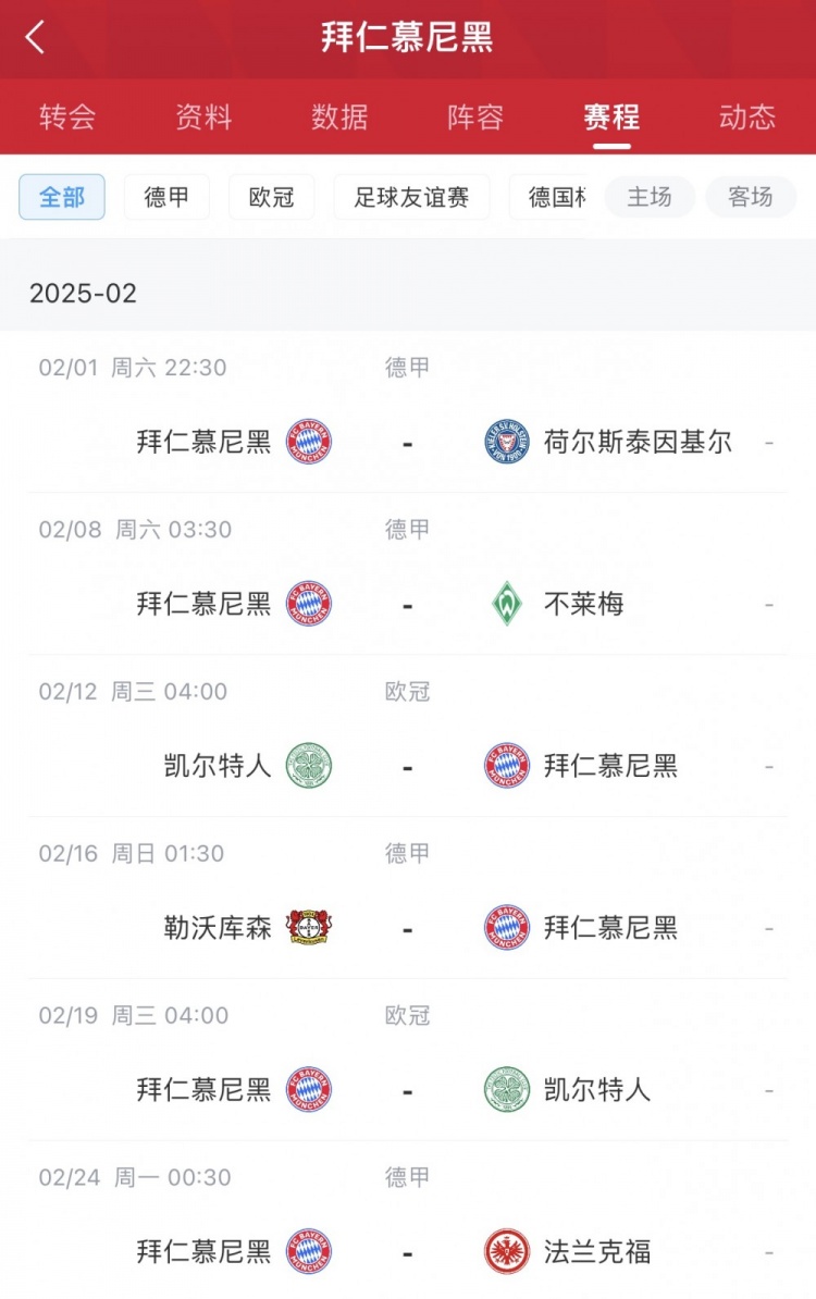 拜仁將在北京時(shí)間2月12日4:00客場(chǎng)對(duì)陣凱爾特人,2月16日1:30客場(chǎng)與勒沃庫(kù)森展開(kāi)爭(zhēng)冠關(guān)鍵戰(zhàn),2月19日4:00主場(chǎng)迎來(lái)與凱爾特人的第二回合較量,2月24日0:30主場(chǎng)交手法蘭克福。