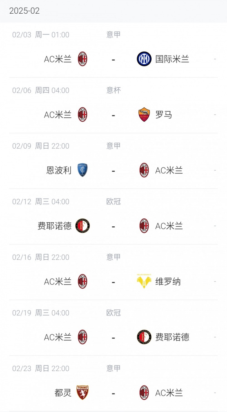 發(fā)布時(shí)間:2025年01月31日 23:06點(diǎn)擊:欄目:足球新聞 1月31日訊 歐冠附加賽抽簽結(jié)束,AC米蘭將迎戰(zhàn)費(fèi)耶諾德。米蘭2月份賽程如上圖。其中,北京時(shí)間2月3日將迎來本賽季意甲第二次米蘭德比,3天后的2月6日在意大利杯迎戰(zhàn)羅馬;12日和19日在歐冠附加賽迎戰(zhàn)費(fèi)耶諾德,AC米蘭先客后主。 除特別注明外,本站所有內(nèi)容均為九球直播整理排版,轉(zhuǎn)載請(qǐng)注明出處:關(guān)鍵!AC米蘭2月賽程:3日米蘭德比 6日戰(zhàn)羅馬 12&19日歐冠附加賽 本文標(biāo)簽: 足球 意甲 AC米蘭 國際米蘭 羅馬 歐冠