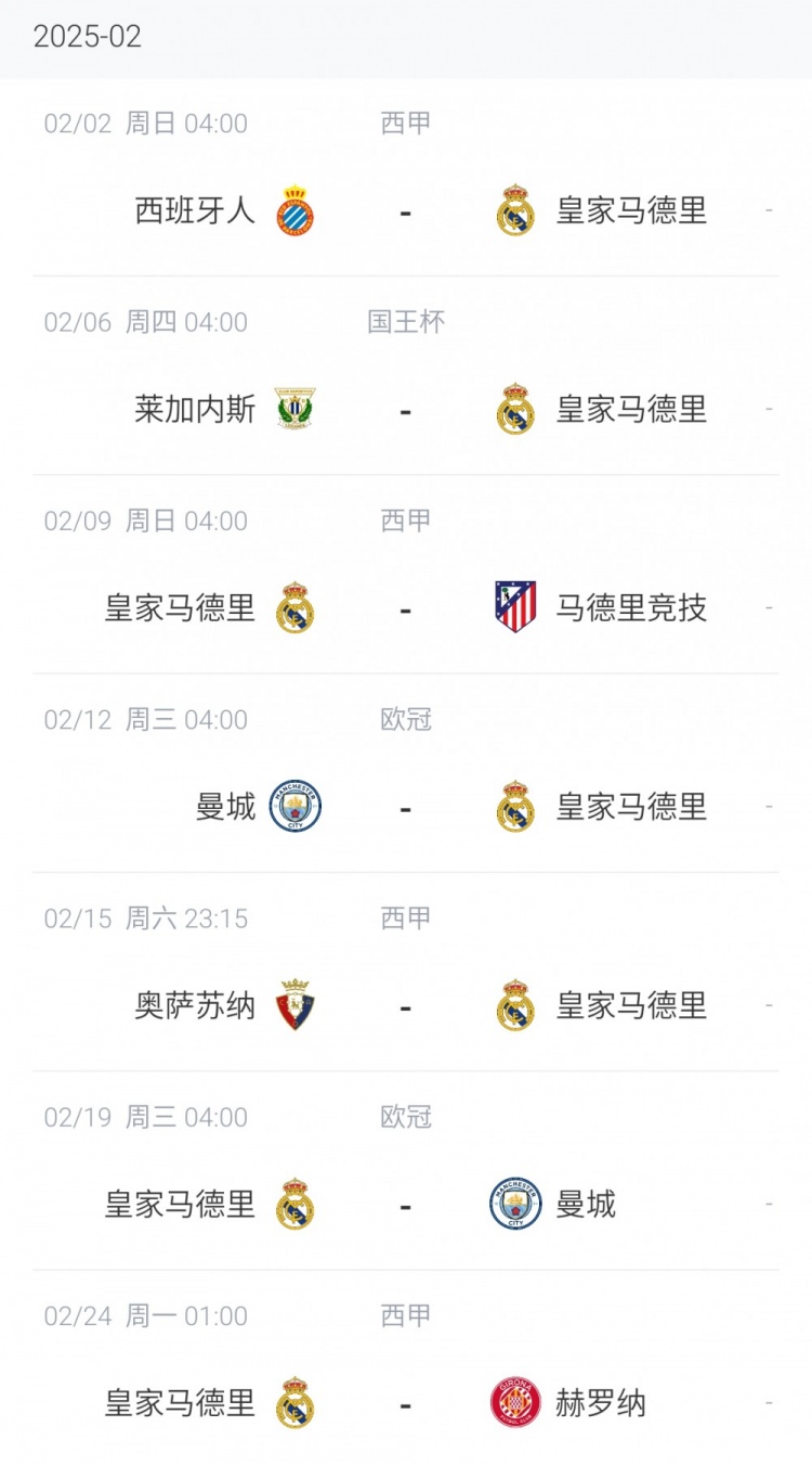 1月31日訊 歐冠附加賽抽簽儀式結(jié)束,皇馬將在附加賽對(duì)陣曼城,兩隊(duì)爭(zhēng)奪一個(gè)16強(qiáng)名額!皇馬2月份具體賽程如上圖。
