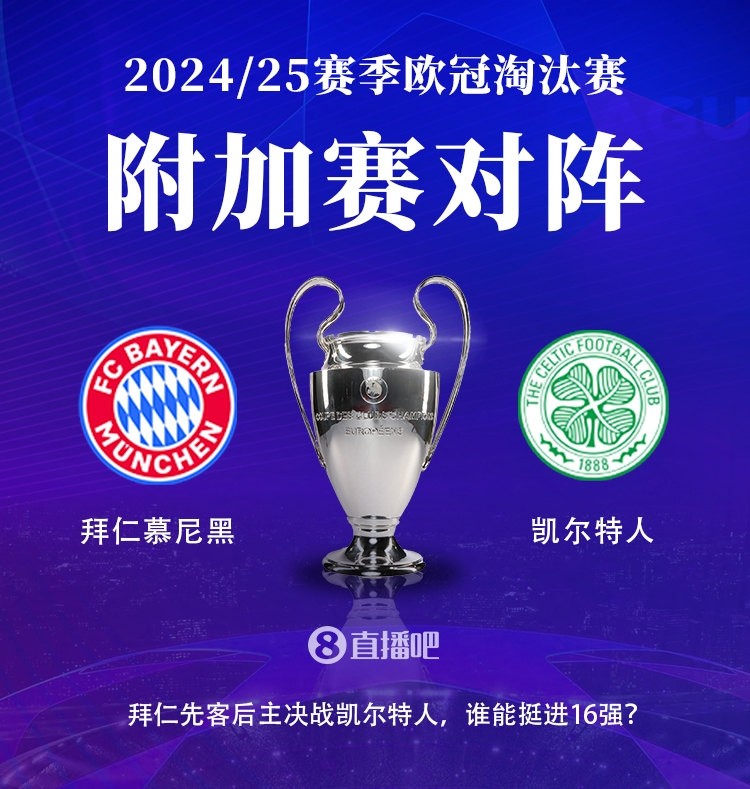1月31日訊 2024-25賽季歐冠淘汰賽階段附加賽抽簽結果出爐,拜仁將先客后主交手凱爾特人,角逐16強名額。