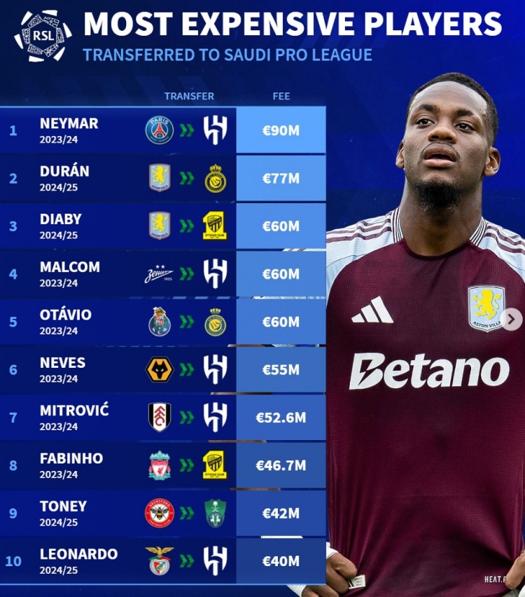 德轉(zhuǎn)列沙特超歷史引援榜:歐元