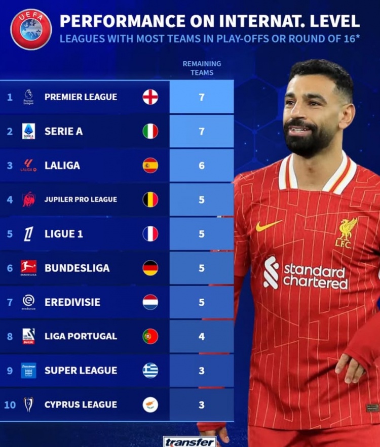 2月1日訊 本賽季歐戰(zhàn)小組賽已經(jīng)完賽,《轉(zhuǎn)會(huì)市場(chǎng)》也統(tǒng)計(jì)了各大聯(lián)賽在歐戰(zhàn)淘汰賽階段的席位: