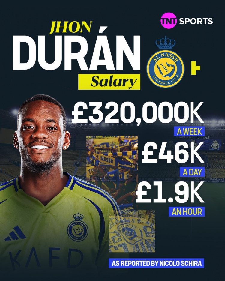 據(jù)意大利名記斯基拉的消息,杜蘭在利雅得勝利的周薪高達(dá)32萬英鎊,這相當(dāng)于日薪4.6萬鎊,時薪1900鎊。(在沙特聯(lián)賽球員無需繳稅)