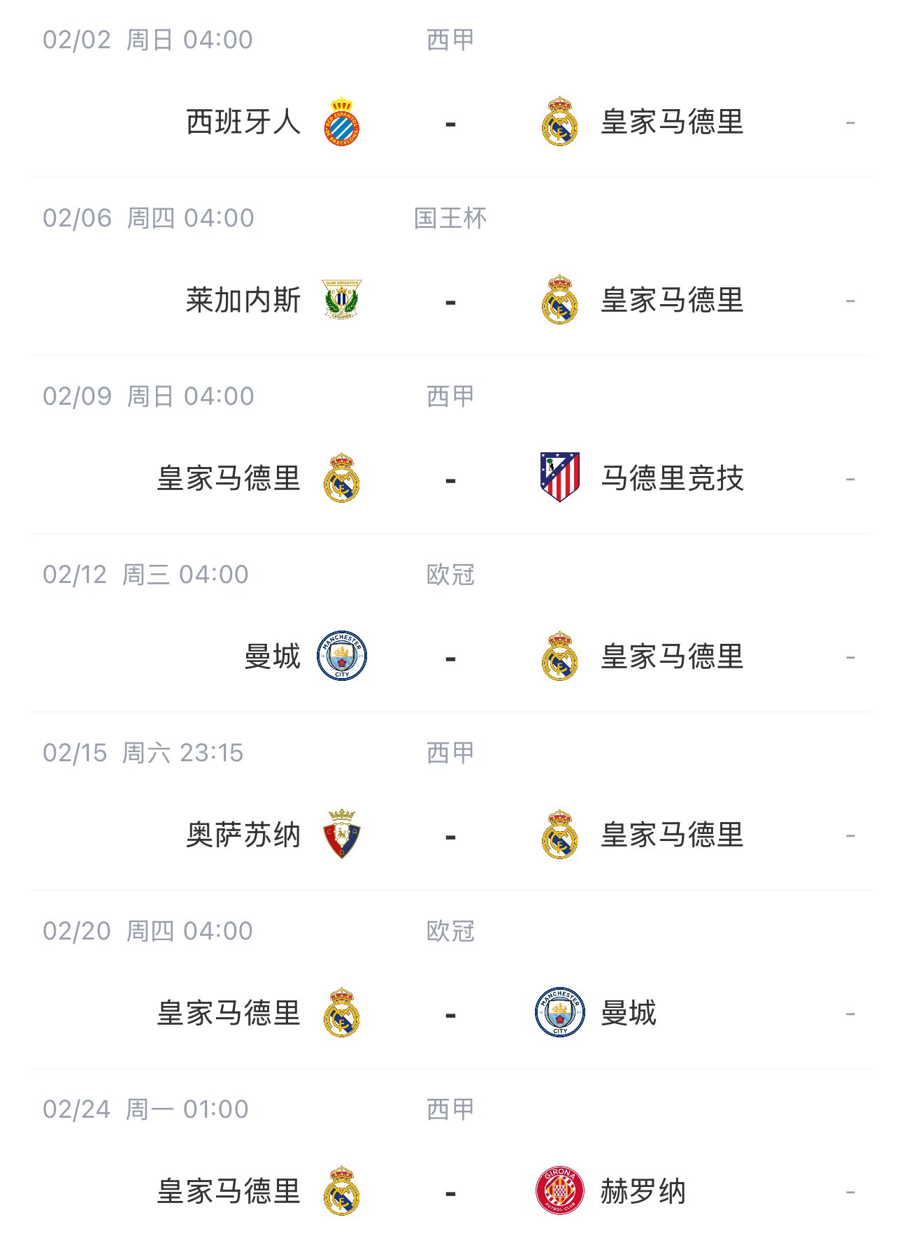 皇馬2月面臨賽程考驗,由于巴薩和馬競直通歐冠16強(qiáng),皇馬比這兩位西甲爭冠對手多出兩場歐冠淘汰賽附加賽,而且附加賽對手還是曼城。