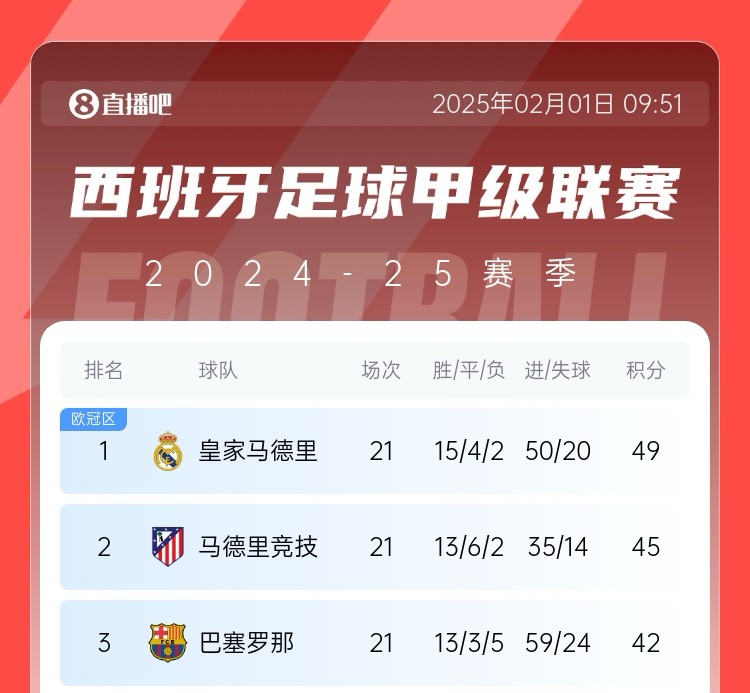 目前的西甲積分榜,皇馬49分居首,馬競45分第二,巴薩42分第三。