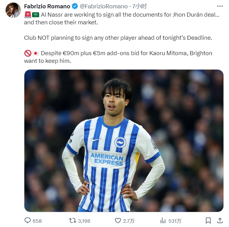 2月1日訊 記者羅馬諾此前報道,利雅得勝利9000萬歐+500萬歐浮動報價三笘薰,但被布萊頓拒絕。羅馬諾強調(diào)了布萊頓希望留下他。這條推文熱度超高,并且評論里幾乎所有球迷都不理解布萊頓的操作。
