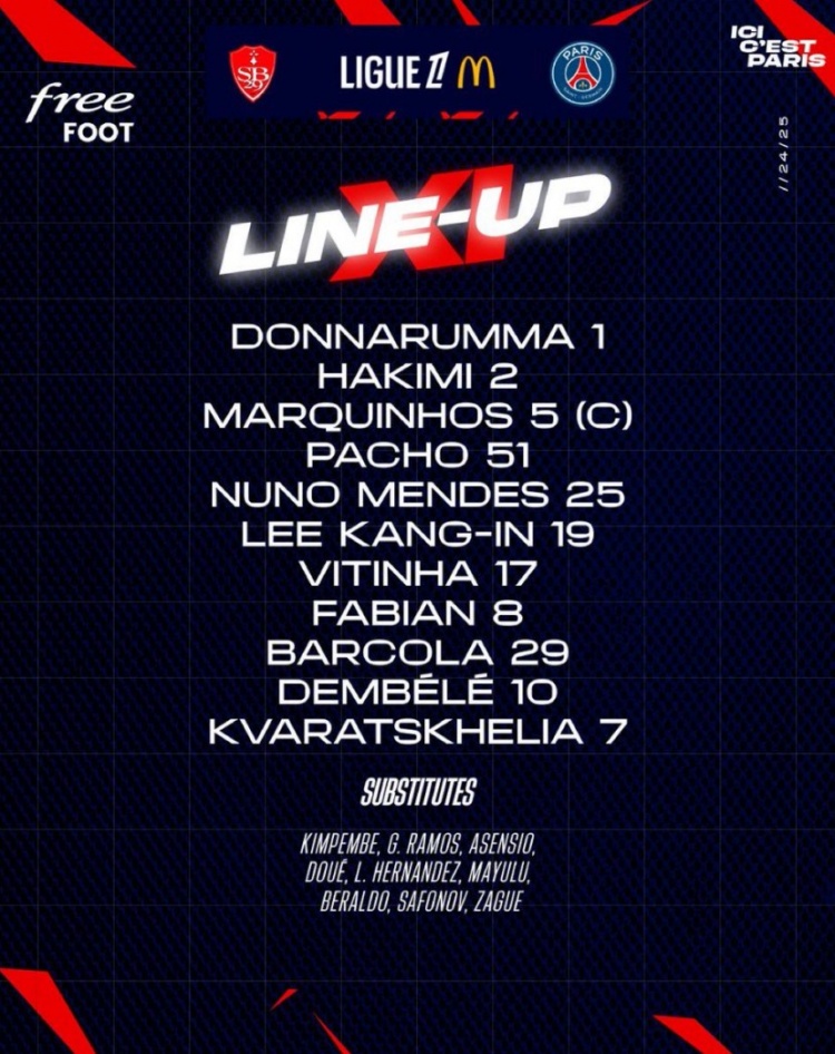 巴黎首發(fā):1-多納魯馬、2-阿什拉夫、5-馬爾基尼奧斯、51-帕喬、25-努諾-門德斯、19-李剛?cè)省?7-維蒂尼亞、8-法比安-魯伊斯、29-巴爾科拉、10-登貝萊、7-克瓦拉茨赫利亞