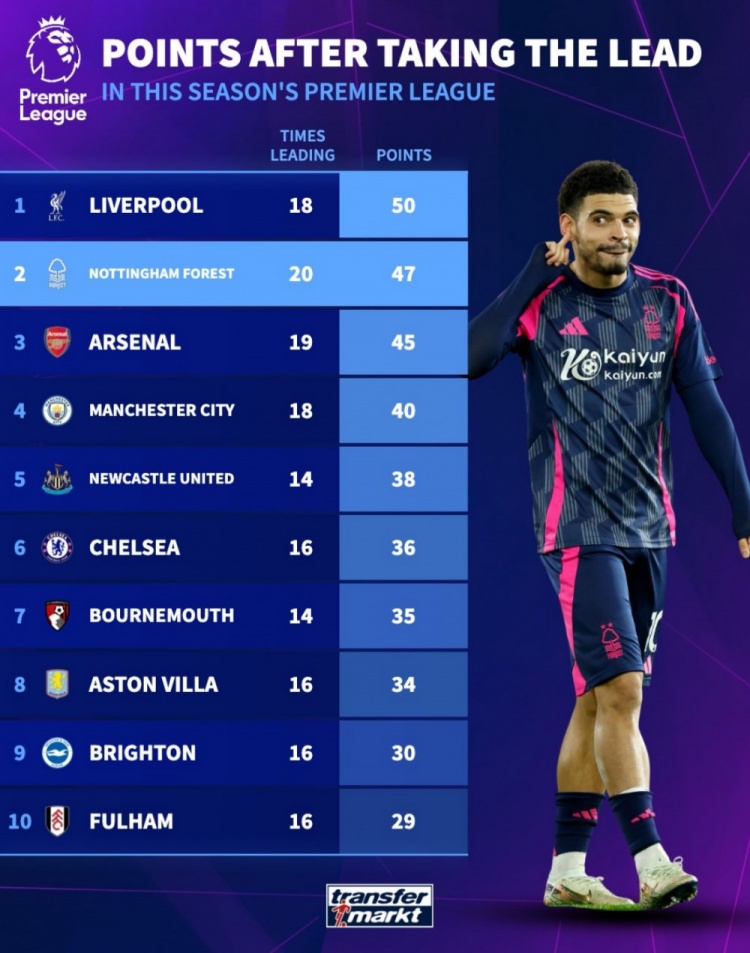 據(jù)統(tǒng)計(jì),本賽季英超至今,森林在比賽中取得領(lǐng)先的情況下最后拿到了47個(gè)積分,是第二多的球隊(duì),僅次于利物浦。