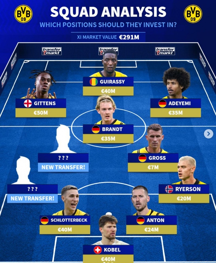 2月1日訊 多特在本賽季德甲表現(xiàn)低迷,沙欣也因此下課,《轉(zhuǎn)會市場》也簡要列出了多特當(dāng)前主力陣,指出他們需要補強左路后防。