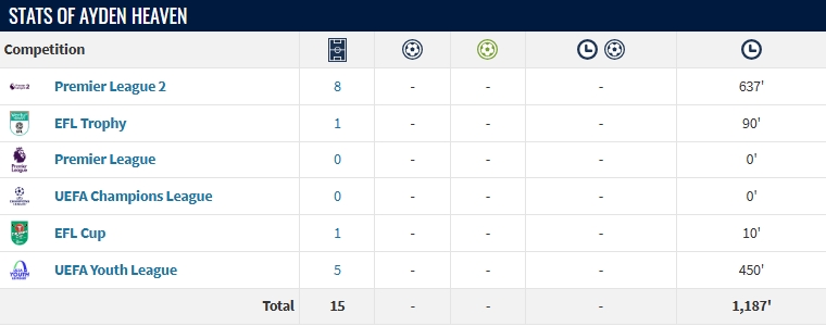 海文本賽季各項(xiàng)賽事出戰(zhàn)15場比賽,基本全都是代表阿森納青年隊(duì)。英超、歐冠賽場他均沒有獲得出場機(jī)會,本賽季聯(lián)賽杯第四輪阿森納3-0普雷斯頓的比賽,他替補(bǔ)登場10分鐘,這也是他本賽季、乃至整段阿森納生涯中唯一一次代表一線隊(duì)出戰(zhàn)的記錄。