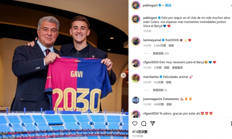 加維曬出自己和巴薩主席拉波爾塔一起手持印有2030字樣的巴薩球衣,并配文:“很高興能夠在我生命中最愛的俱樂部繼續(xù)效力很多年!巴薩球迷們,更多難忘的時刻在等待著我們一起經(jīng)歷!巴薩萬歲!”