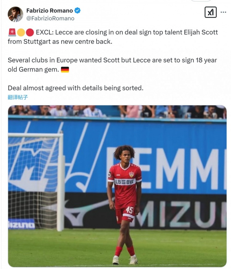 除特別注明外,本站所有內(nèi)容均為九球直播整理排版,轉(zhuǎn)載請(qǐng)注明出處:羅馬諾:萊切接近簽下斯圖加特18歲中衛(wèi)斯科特