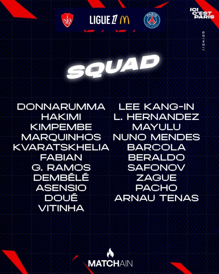 2月1日訊 北京時間2月2日凌晨0點,法甲第20輪,巴黎圣日耳曼將在客場對陣布雷斯特。比賽開始前,巴黎圣日耳曼官方公布了本場比賽大名單,若昂-內(nèi)維斯、扎伊爾-埃梅里缺席。