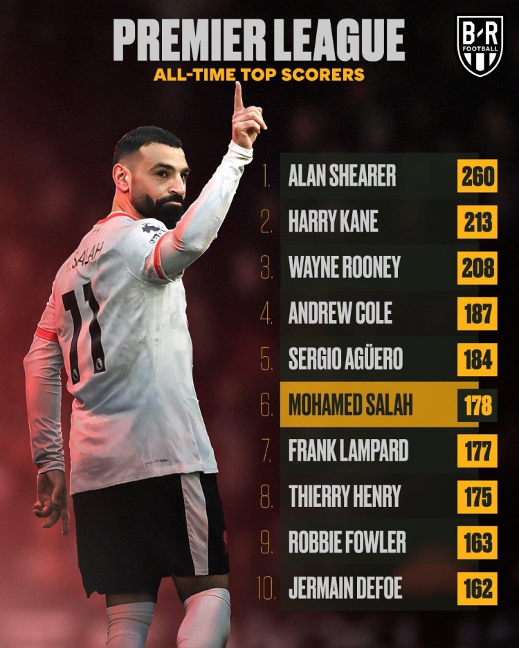 這粒進(jìn)球是薩拉赫在英超中打進(jìn)的第178粒進(jìn)球,超越了切爾西名宿蘭帕德(177球),獨(dú)享英超歷史射手榜第6。不過(guò),薩拉赫的出場(chǎng)次數(shù)比蘭帕德少了323次。