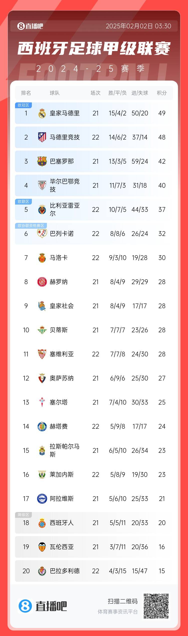 發(fā)布時(shí)間:2025年02月02日 03:50點(diǎn)擊:欄目:足球新聞 2月2日訊 西甲聯(lián)賽第22輪,馬競(jìng)2-0馬洛卡,先賽距榜首1分。最新西甲積分榜↓ 除特別注明外,本站所有內(nèi)容均為九球直播整理排版,轉(zhuǎn)載請(qǐng)注明出處:西甲積分榜:馬競(jìng)先賽1場(chǎng)距榜首1分 巴薩落后皇馬7分位居第三 本文標(biāo)簽: 西甲 皇家馬德里 巴塞羅那 馬德里競(jìng)技 西班牙人 巴列卡諾 馬洛卡 瓦倫西亞 塞維利亞 皇家社會(huì) 比利亞雷亞爾 塞爾塔 貝蒂斯 赫塔費(fèi) 奧薩蘇納 巴拉多利德 赫羅納 畢爾巴鄂競(jìng)技 萊加內(nèi)斯 拉斯帕爾馬斯 阿拉維斯 足球