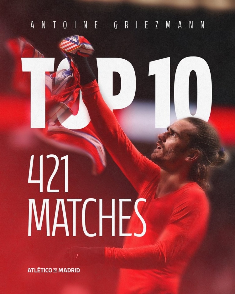 2月2日訊 馬競在本輪西甲2-0力克馬洛卡,老將格列茲曼替補建功。馬競官方統(tǒng)計顯示格列茲曼已經(jīng)躋身隊史出場榜前十。