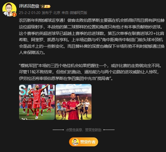 02月02日訊 本輪英超,利物浦客場2-0戰(zhàn)勝伯恩茅斯,賽后著名評述員詹俊在社媒做出點評。