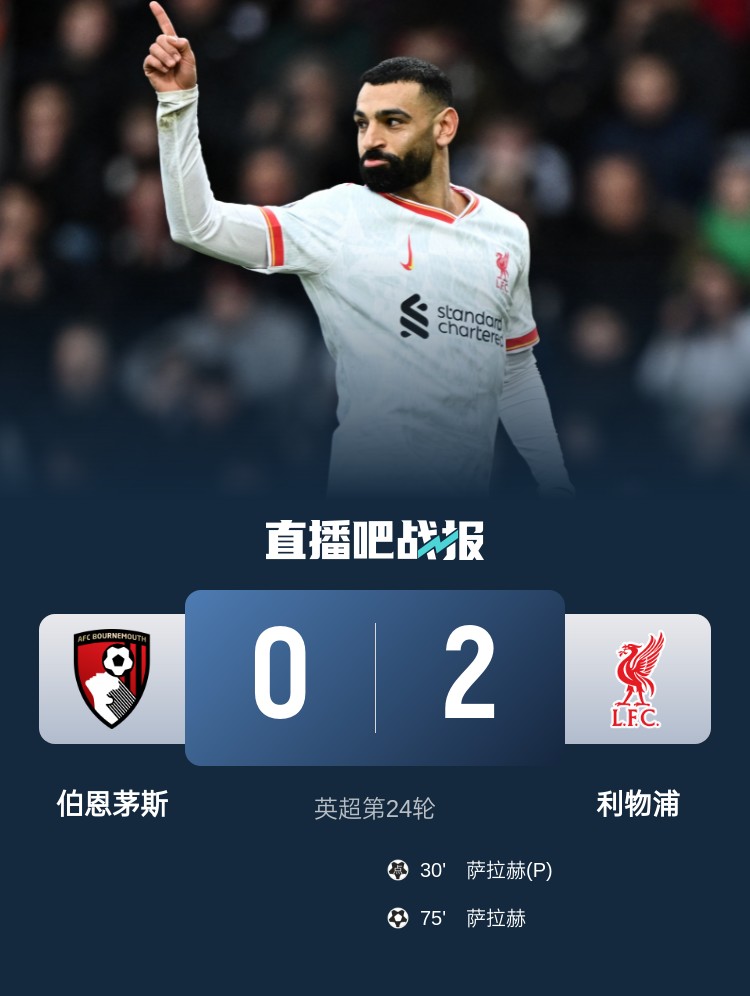 薩拉赫梅開二度,利物浦2-0戰(zhàn)勝伯恩茅斯,9分領(lǐng)跑積分榜。