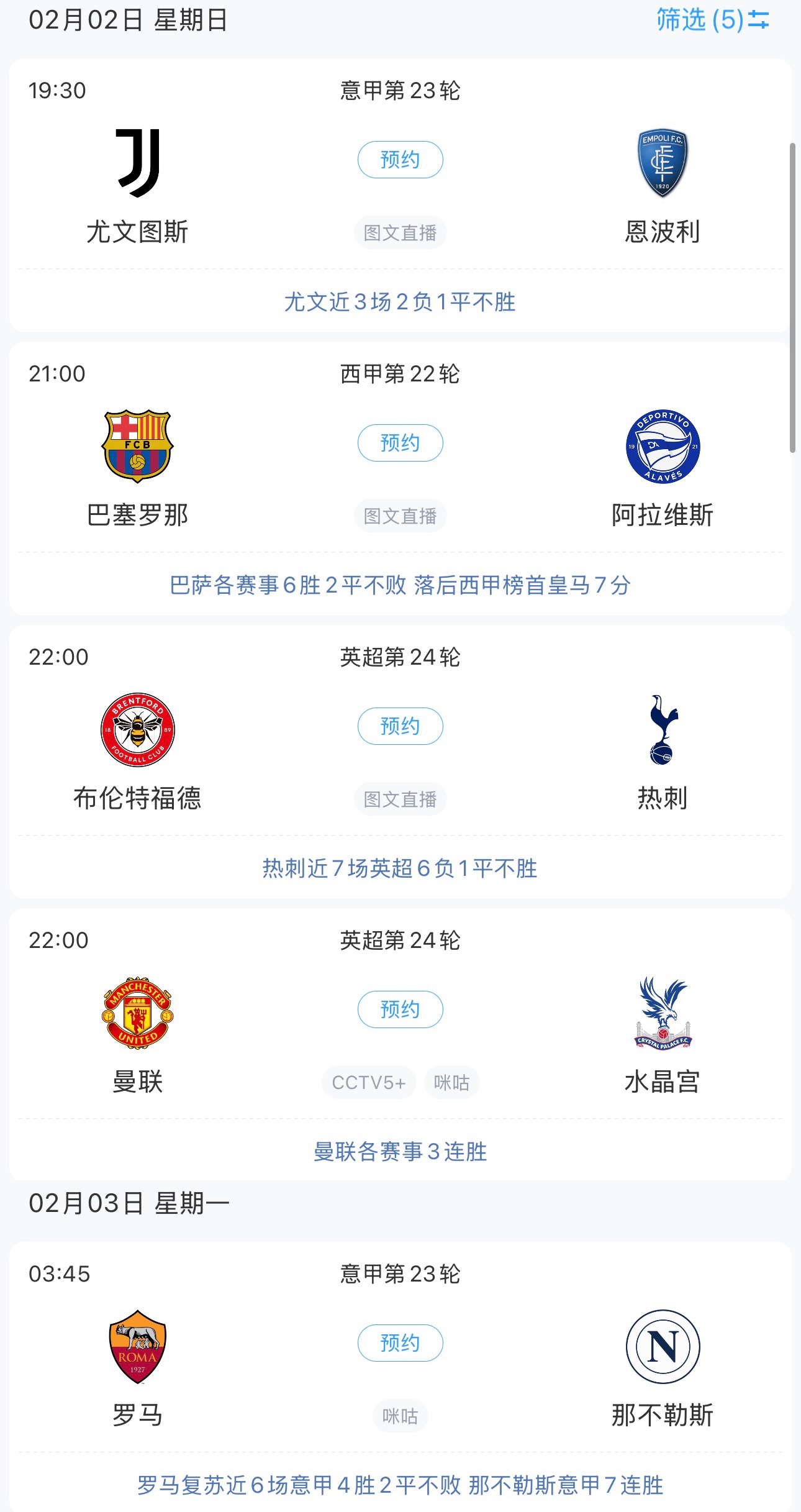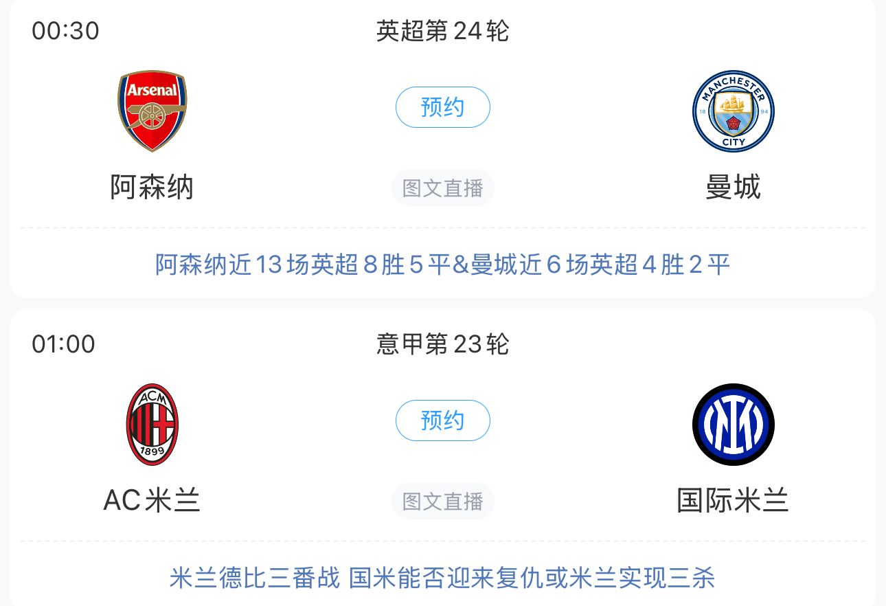 今夜明晨,五大聯(lián)賽繼續(xù)進(jìn)行,其中不乏焦點(diǎn)對(duì)決,阿森納主場(chǎng)大戰(zhàn)曼城,米蘭德比三番戰(zhàn)即將打響。春節(jié)假期臨近尾聲,吧友們且看且珍惜~